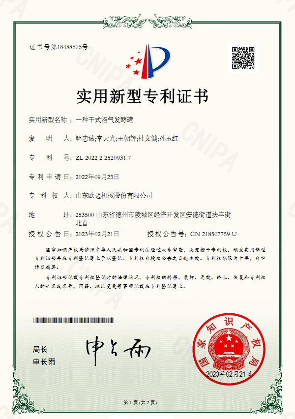 一种干式沼气发酵罐2022225209317实用新型专利证书20230221