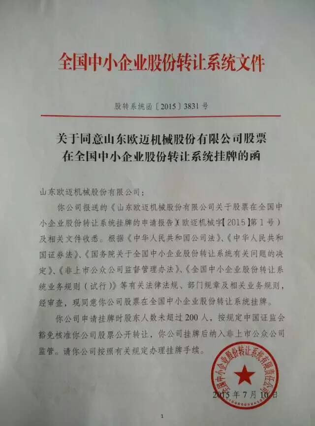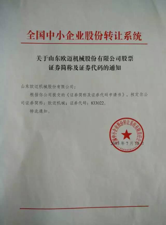 子曰:工欲善其事,必先利其器,完事的工具才能打造完美的产品。完善的公司才能主导公司的大方向。欧迈机械于2014年5月29日正式签署“企业挂牌新三板项目合作意向书”经过这近一年紧锣密鼓的工作,终于挂牌成功。在这一年内各个部门多少个日日夜夜加班加点准备资料,终于见证了欧迈的成长。