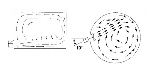 在无挡板的搅拌容器中,搅拌器偏心安装可以获得较好的搅拌效果。而在大型油釜中,若采用搅拌器侧面插入安装方式,通常可获得较好的釜内整体循环。该场合若采用侧面射流混合方式,也可得到相似的混合效果,如图所示。